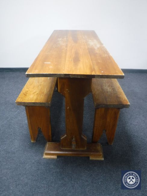 A pine refectory kitchen table together with two benches