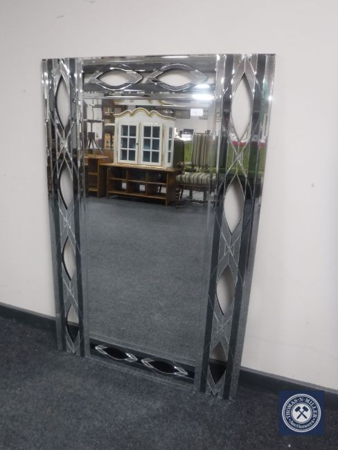 A contemporary all glass mirror with pierced frame