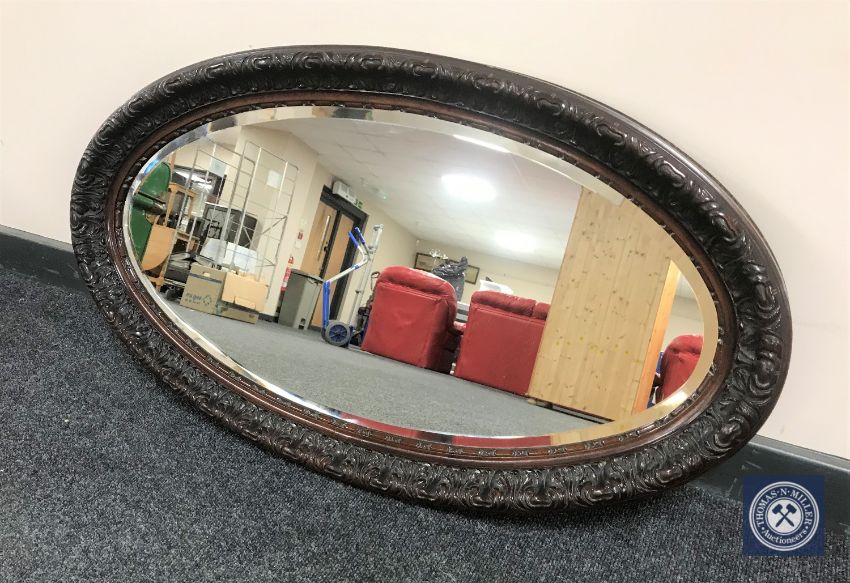 A heavily carved mahogany oval mirror