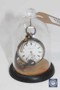 A silver pocket watch by Fattorini and Sons, Bradford, with key under glass dome