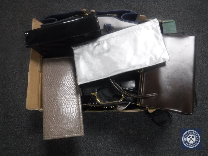 A box of assorted lady's handbags