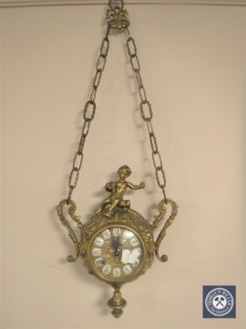 A continental gilt metal suspension clock with enamel dial and surmounted with a cherub, with key
