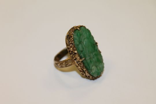A Chinese silver gilt carved jade ring