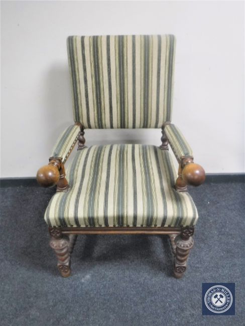 A carved oak armchair in striped upholstery