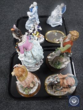 A group of seven Continental porcelain figures including Capo Di Monte, Dresden, brass framed mirror. (8)