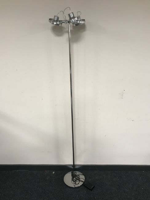 A box containing two decorative mirrors, pottery vase on stand, oak tray etc, together with a chrome standard lamp