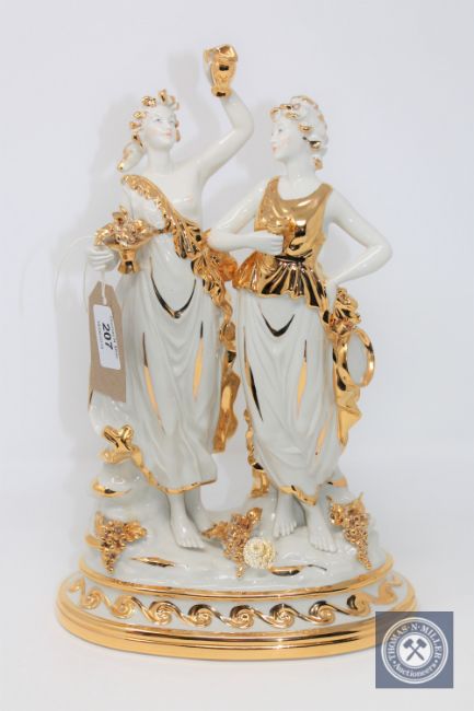 A Capo Di Monte figure with gilt highlights - Grecian style ladies.