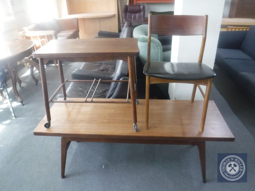 A Danish teak rectangular coffee table together with a teak turnover top trolley and a dining chair
