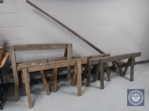 Seven vintage wooden trestle stands together with a wooden post