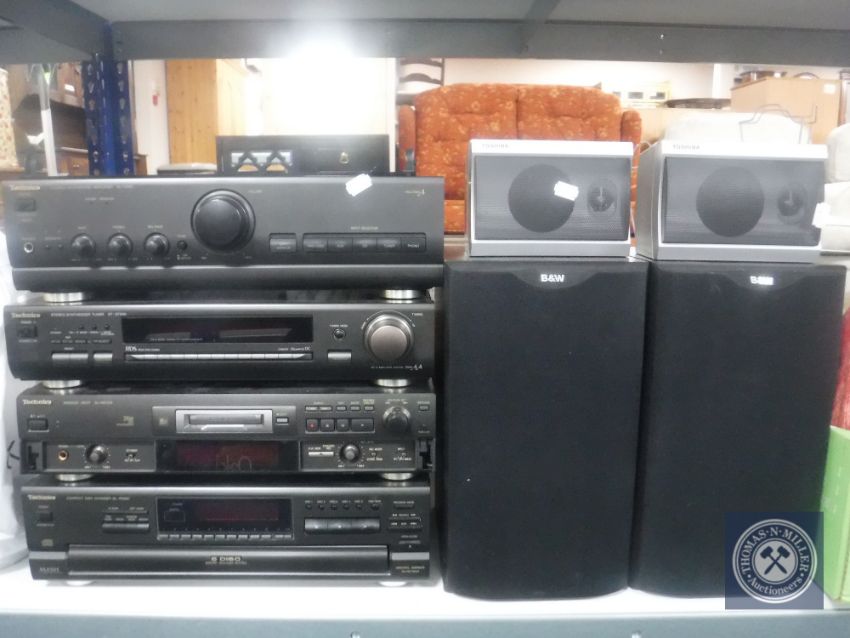 Four Technics hifi separates including integrated amplifier SU-V500, stereo synthesizer tuner ST-GT550 , mini disc deck SJ-ND100 and compact disc changer SL-PD 887 together with a pair of B&W speakers and Toshiba speakers
