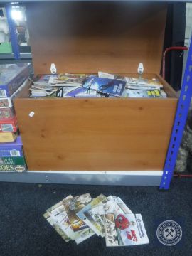 There are far too many comics to count. They stack all the way down to the bottom of the blanket box so there will be several hundred of them at least.