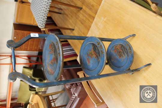 A Chinoiserie blue lacquered three tier folding cake stand
