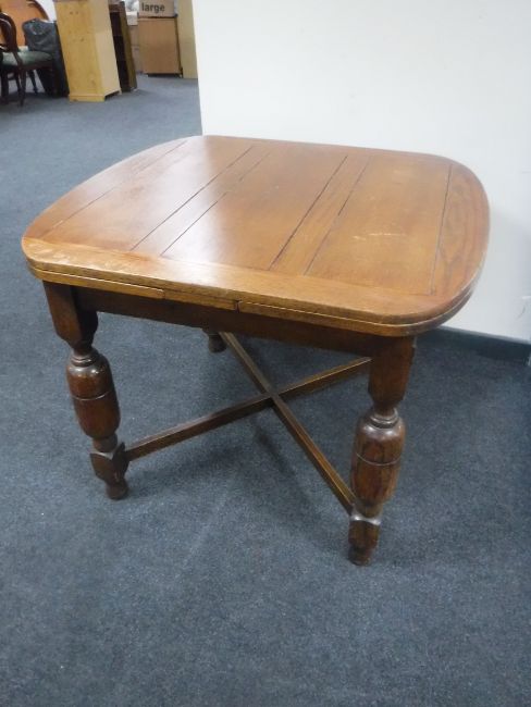 A 1930's oak pull out dining table together with a set of five oak ladder back chairs