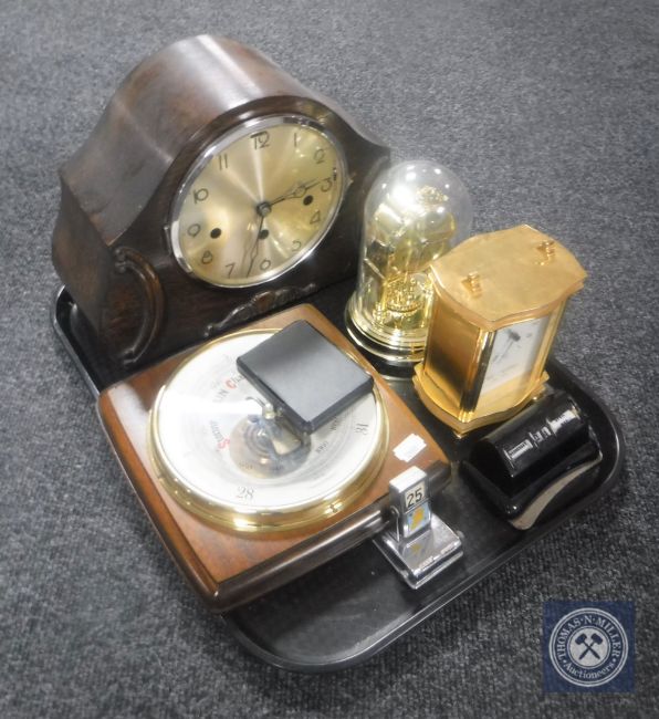 A tray of oak cased mantel clock, Huara clock under shade, brass battery operated carriage clock, two desk calendars and barometer