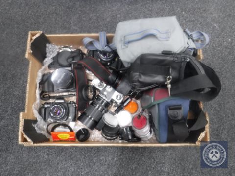 A collection of assorted cameras, Canon, Pentax and Chinon, lenses, filters and camera bags