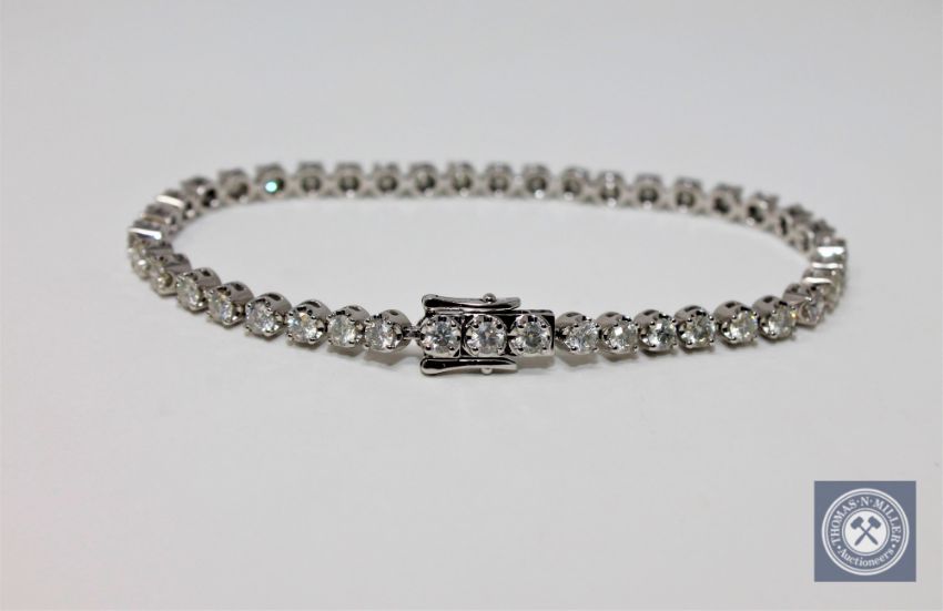 A 14ct white gold diamond tennis bracelet, featuring 42 round brilliant cut white diamonds 3.47ct. With certification.