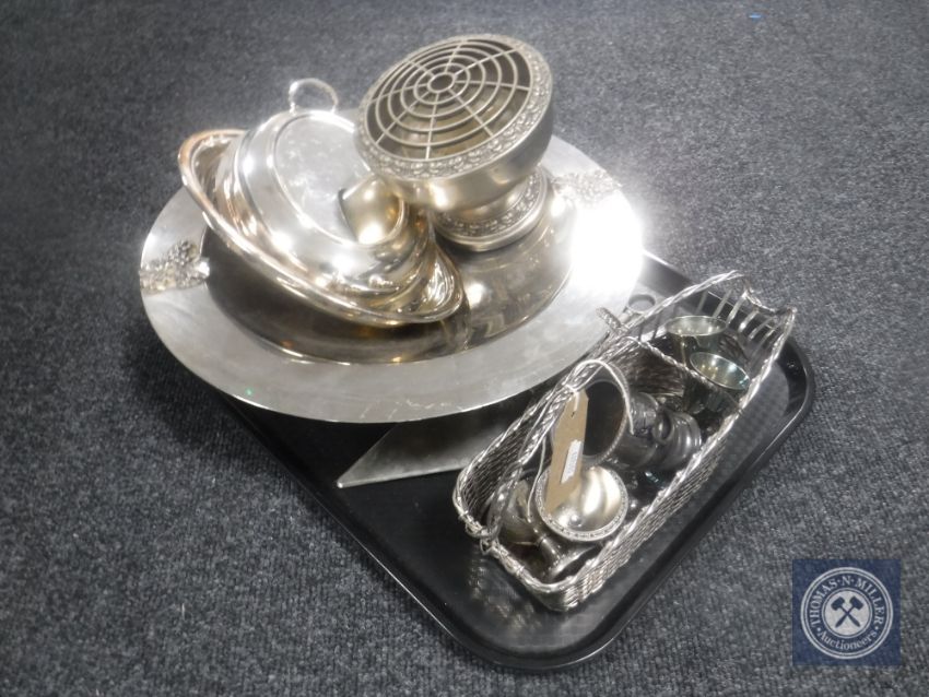 A tray of 20th century plated wares, wine basket, miniature cooler, entree dish and cover, fruit bowl etc