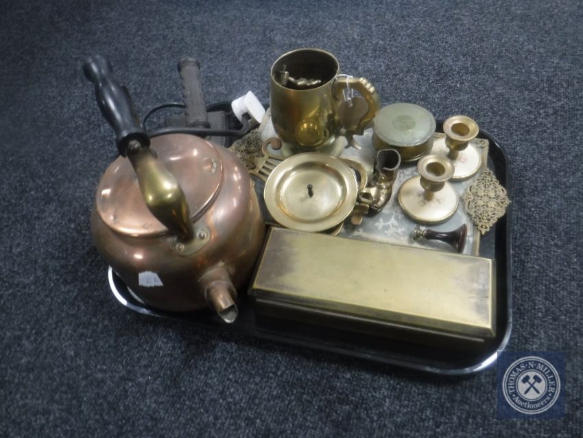 A tray of early 20th century brass and copper electric kettle, flat iron, boxed petit point dressing table tray etc