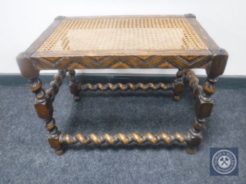 An early 20th century carved oak barley twist bergere dressing table stool