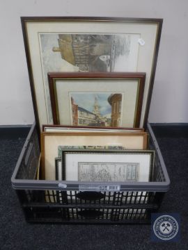 A box of assorted framed pictures and prints, map of Northumberland after Morden, H W Brewer print Old Newcastle, etc