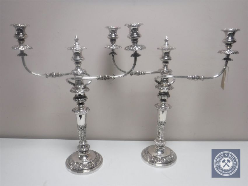 48cm high by 45cm wide. All sconces are present. The upper branches detach which leaves a pair of single column candlesticks. One candelabrum with a dent to the rim of the base. Minor wear to silver plate. Generally very good condition.