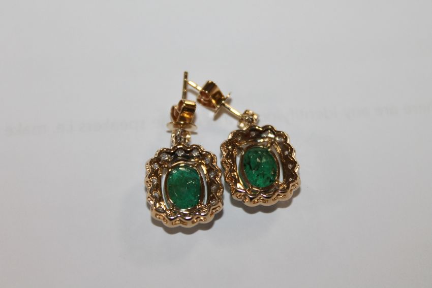 A pair of 14ct yellow gold emerald and diamond earrings featuring 2 cushion cut emeralds 3.93ct 36 round brilliant cut diamonds 0.47ct. With certification.