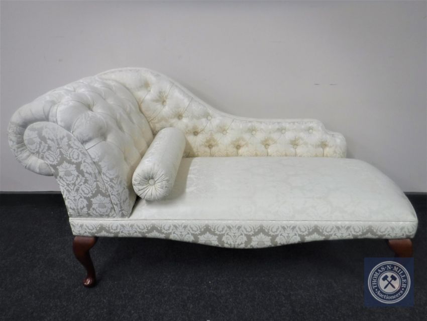 A contemporary chaise longue upholstered in a cream buttoned floral print