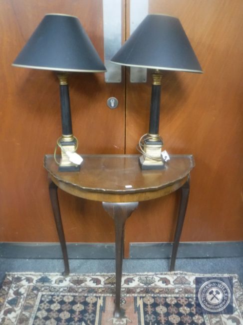 A walnut pie crust edge D-shaped hall table together with a pair of table lamps