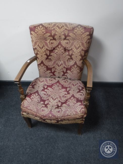 A mid 20th century bedroom chair upholstered in a red and gold classical buttoned fabric