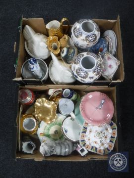 Two boxes of china cake stands, Royal Winton gilded china, Yankee candle, oriental vases, hen dishes