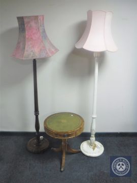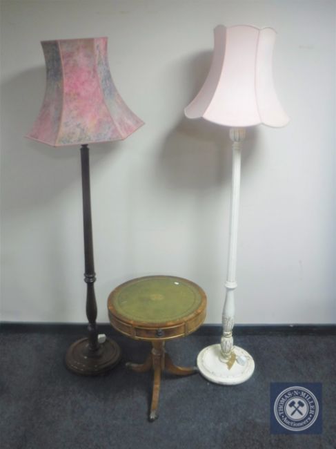 A circular leather topped drum table together with two standard lamps with shades