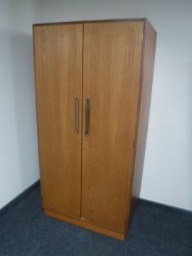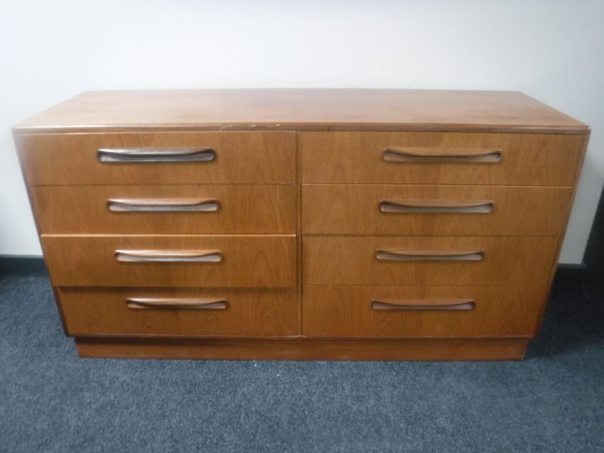 A mid 20th century G Plan teak bedroom suite comprising two double door wardrobes and an eight drawer chest