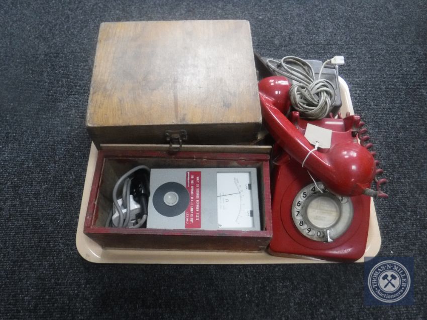 A tray of vintage red telephone, wooden cased neutral earth loop tester, Bakelite Meggar tester