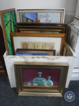 A box of eighteen pictures and prints, oils on canvas etc.