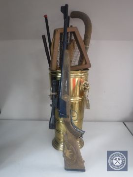 A brass lion mask handled stick stand containing sporting rackets and hockey sticks together with two mid 20th century toy rifles and a wooden potato bucket containing metal ware