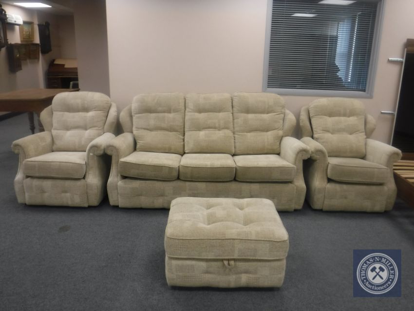 A three-piece lounge suite in beige upholstery, with storage footstool
