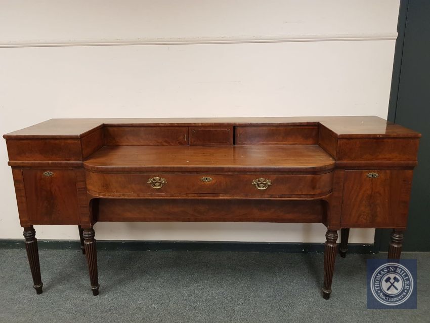 A late George III bow fronted sideboard on tapered legs, width 233 cm