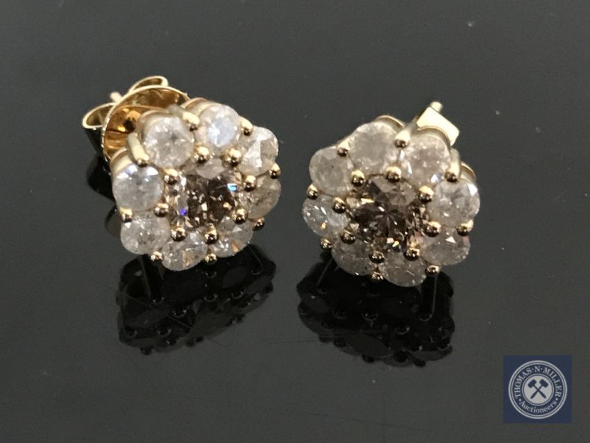 A pair of 18ct yellow gold diamond stud earrings featuring two round brilliant cut cognac diamonds 1.101ct with 16 round brilliant cut diamonds 1.53ct.