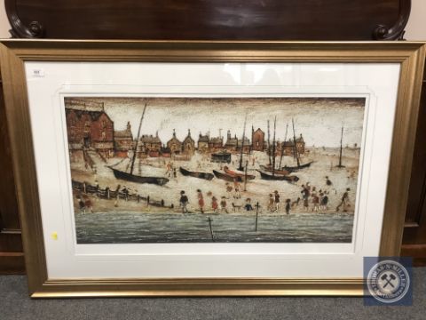 After Laurence Stephen Lowry RA (1887-1976), The Beach, colour print, limited edition, 96 cm by 50 cm, produced by Chelsea Green Editions, with certificate of authenticity.