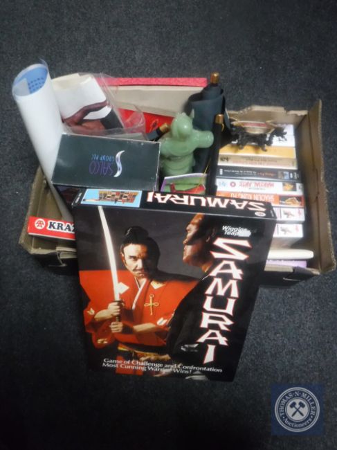 Two boxes of DVD'ss and VHS tapes relating to kung-fu, sew on patches, samurai game etc