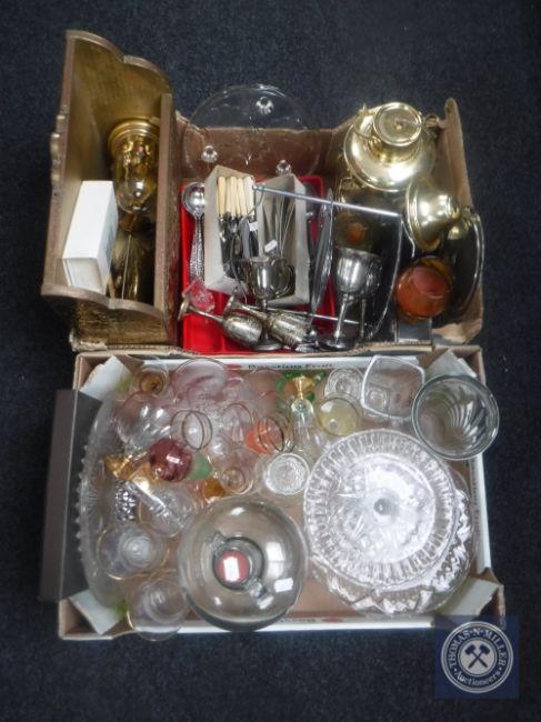 Two boxes of table cutlery, brass magazine rack, plated glass ware, demijohns etc