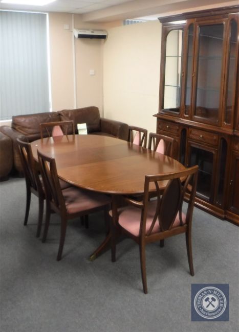 A mahogany G-Plan oval extending dining table together with a set of six chairs