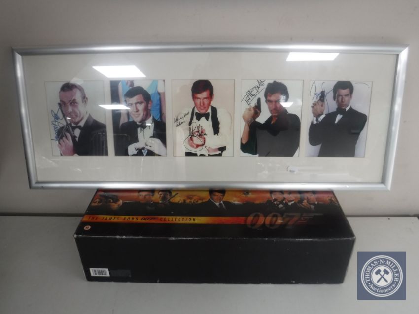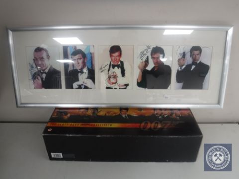 A framed James Bond photographic montage with facsimile signatures and James Bond 007 VHS boxed set