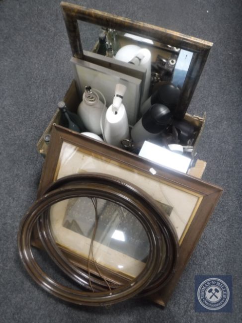 A box of vintage door handles, wall clock, lamps, glass bottles, wall mirror together with two Edwardian picture frames, Northumberland Fusilier photograph and wall shelf