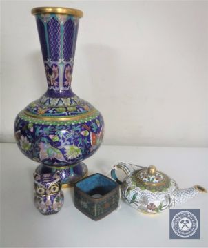 Four pieces of cloisonne including miniature teapot, napkin ring, figure of an owl and a vase, height 20cm