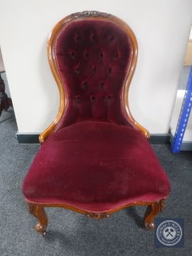 A Victorian mahogany lady's chair in maroon buttoned dralon