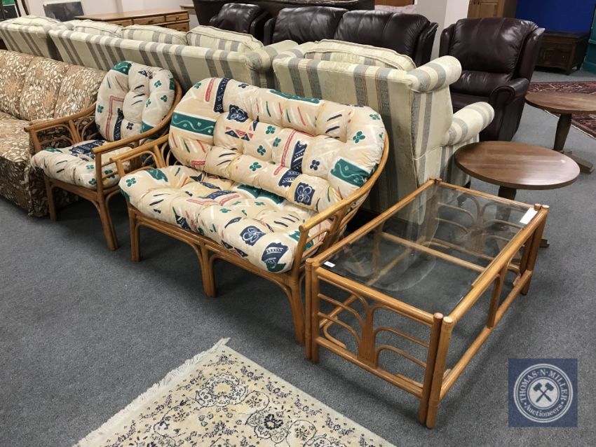 A three piece bamboo conservatory suite comprising of settee, armchair and glass topped coffee table