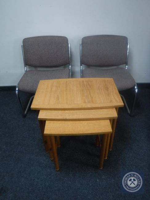 A nest of three teak effect tables and a pair of upholstered reception chairs