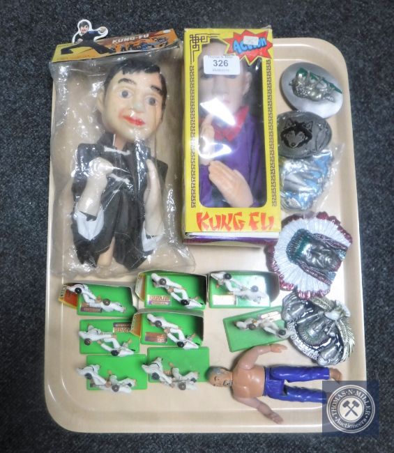 A tray of eight Brittains die-cast kung-fu figures, puppets, five metal native American belt buckles