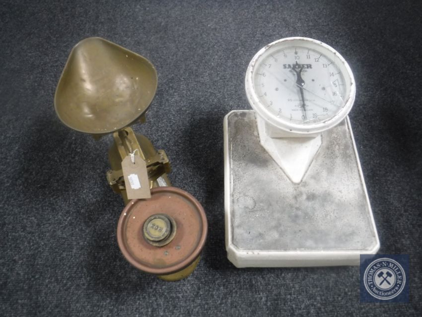 A set of Mordue kitchen scales together with a set of mid 20th century Salter scales